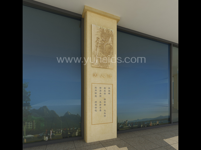 這是一個(gè)會(huì)所走廊的柱子浮雕效果設(shè)計(jì)方案,以優(yōu)質(zhì)黃金麻石材為材質(zhì)配以浮雕的形式雕刻裝飾畫及文字內(nèi)容。柱面尺寸為4400-1100mm。